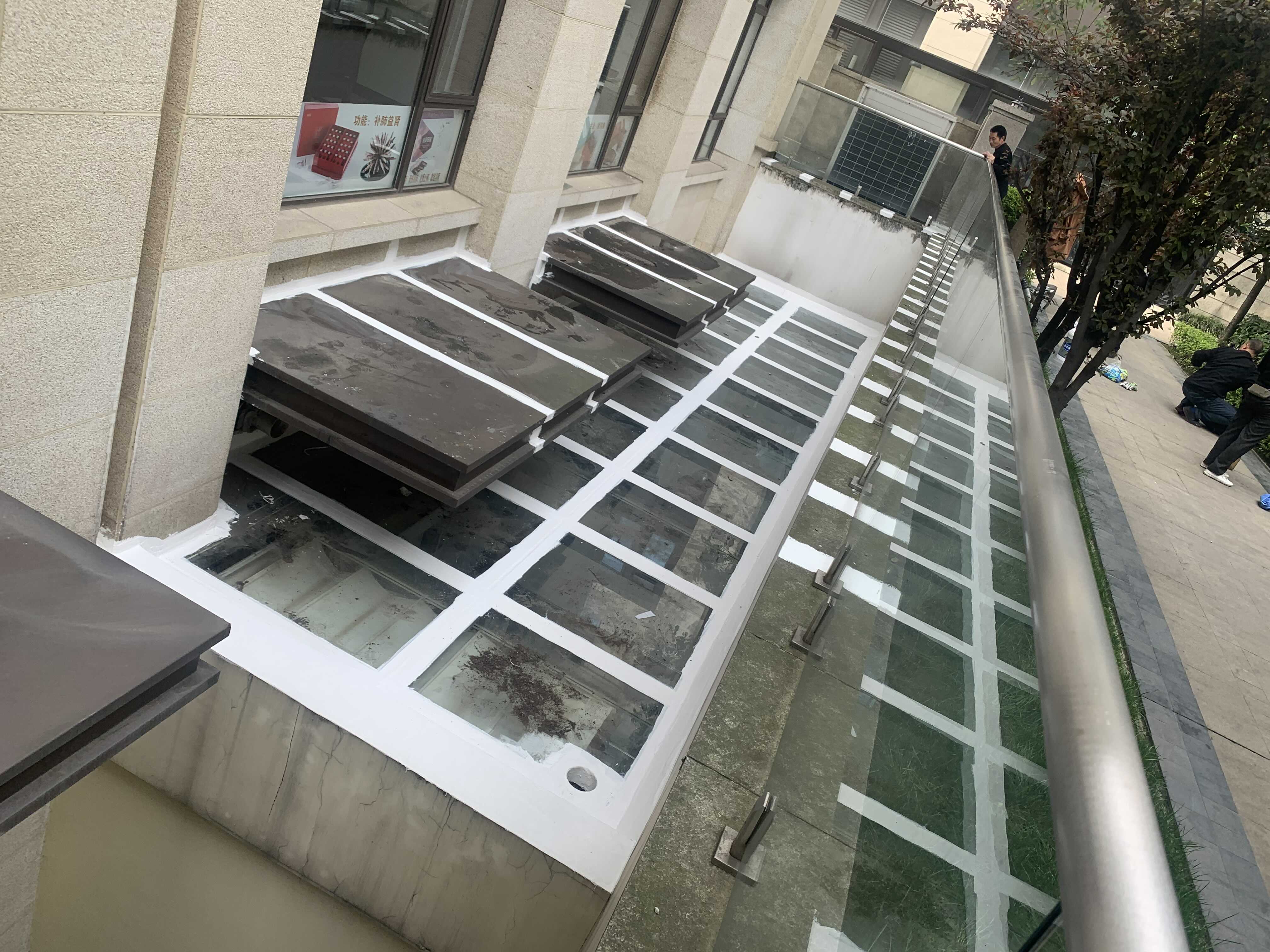 玻璃頂屋面漏雨的情況比較常見,常規(guī)的方法是打密封膠進行處理,但是玻璃頂在夏季太陽暴曬下熱脹、夜間收縮變形,這樣反復變形時間久了,由于玻璃之間縫隙較窄,結構膠就出現(xiàn)了開裂的情況,這就是為什么玻璃接縫過幾年漏雨之后,反復打膠依然無法很好的解決漏雨的問題,我公司采用的是SYR金屬屋面專用防水涂料配合專用縫織聚酯布進行一布三涂的方式進行施工,SYR金屬屋面專用防水涂料外露型的柔性防水涂料可以裸露使用并且具有一定的柔性神所率,所以用來處理玻璃接縫之后防水效果很好,并且耐久性也比較好。