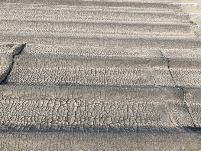 自粘卷材粘貼在彩鋼板上,太陽暴曬表面開裂,墻面高溫之下流淌導(dǎo)致卷材垮落。