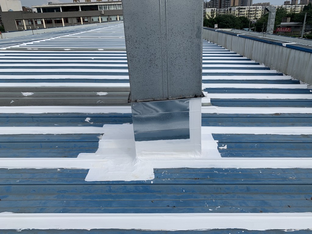 其次,進行基面的處理,如果彩鋼屋面表面有生銹的地方,先用免除銹納米固銹劑進行固銹處理,然后再進行防水涂料的涂膜施工。
