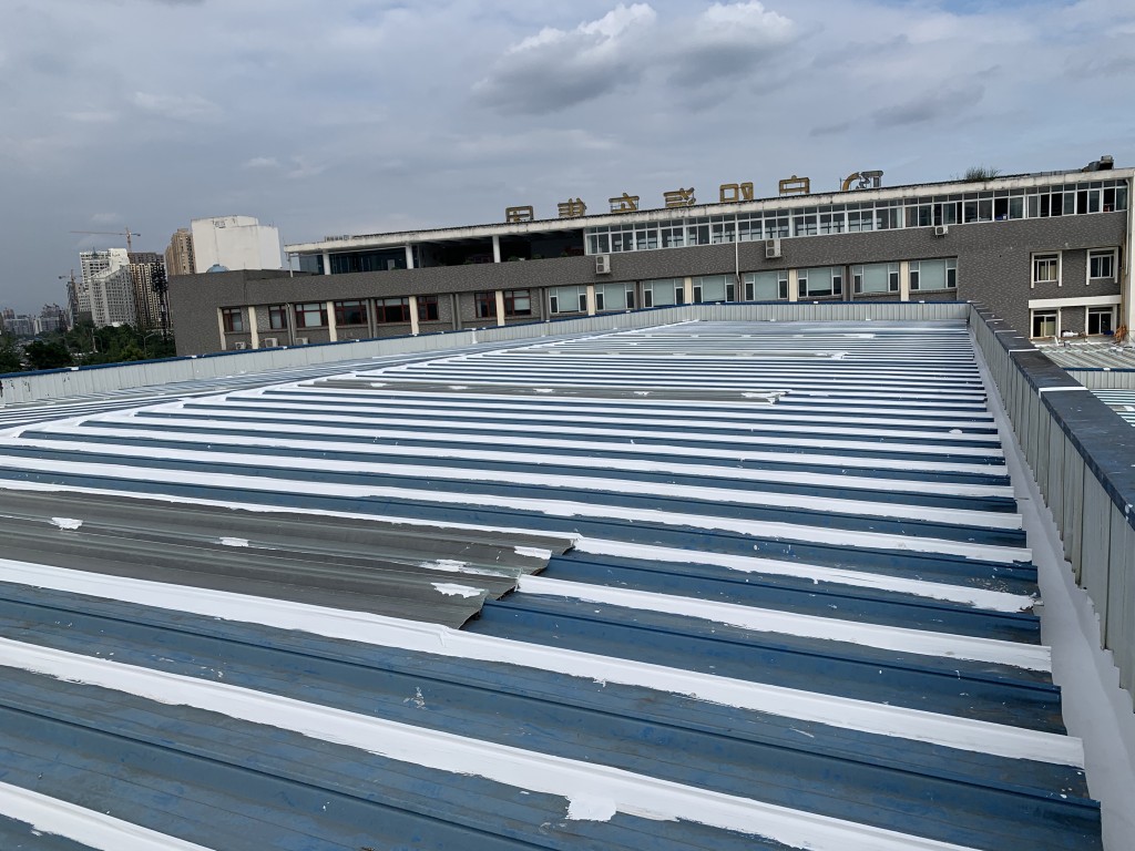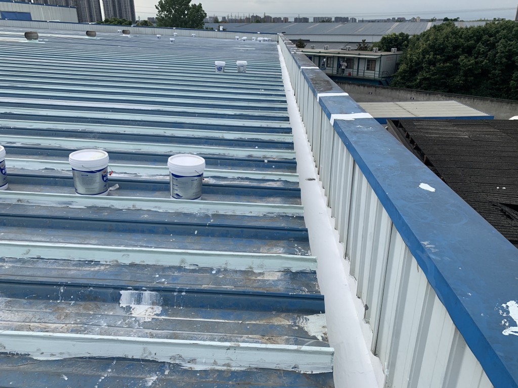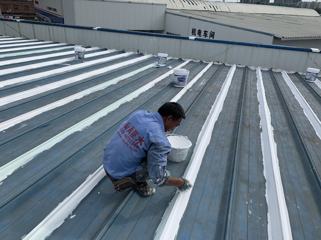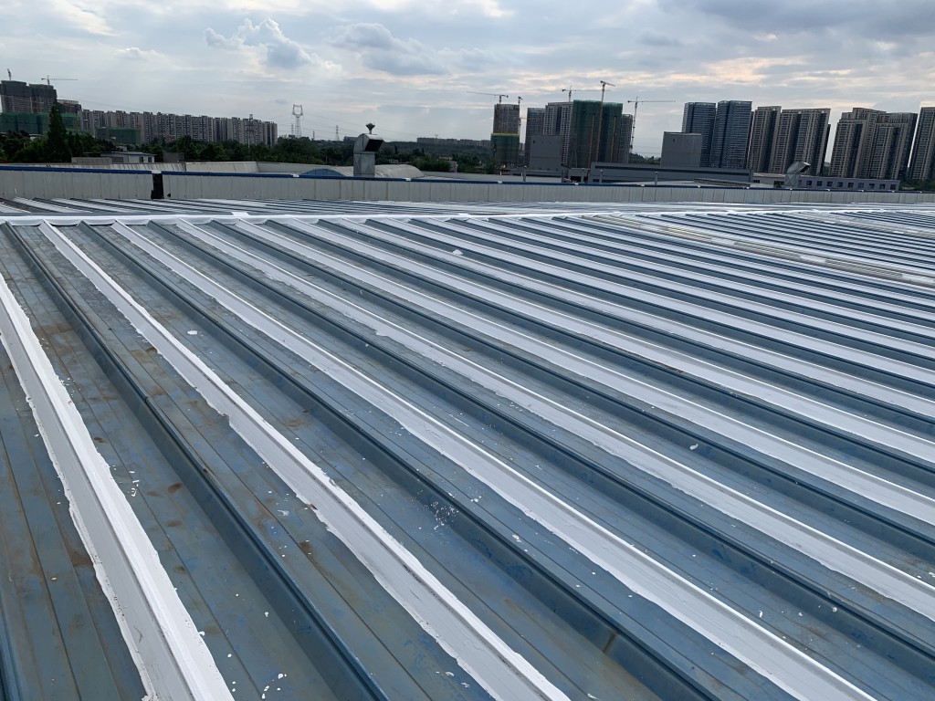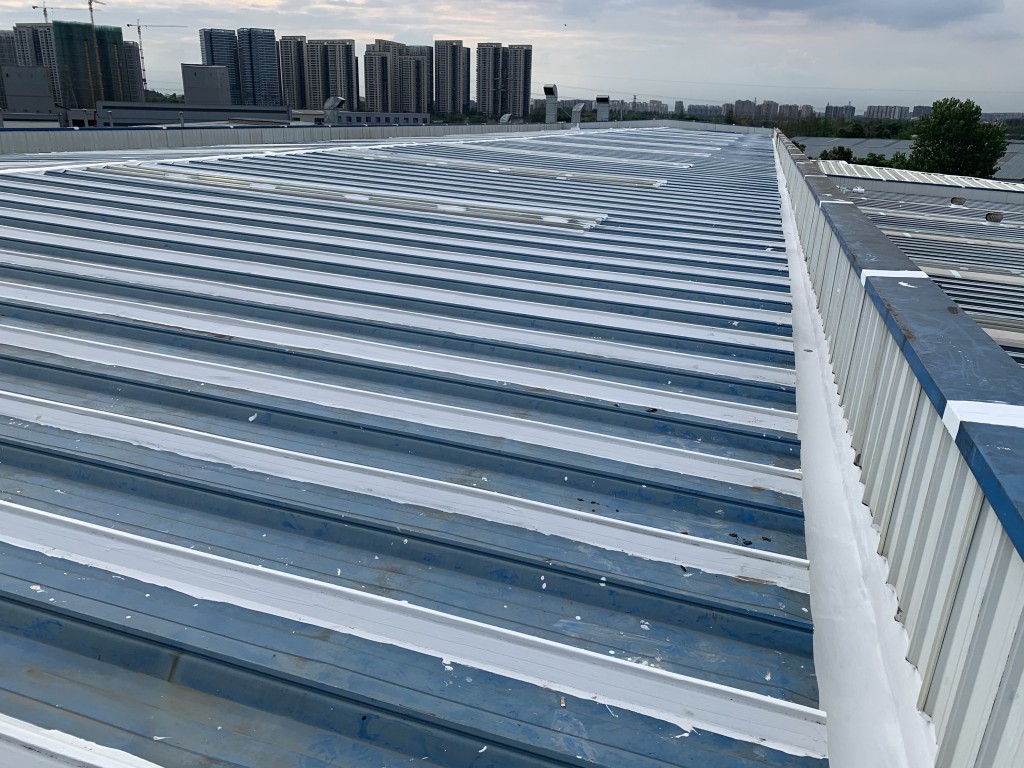 我公司采用的SYR金屬屋面專用防水涂料配合專用縫織聚酯布一布三涂形成的SYR金屬屋面專用防水系統(tǒng)具有防水、防腐、抗紫外線、反射隔熱的效果,特別適合于暴露屋面的使用,耐久性佳。