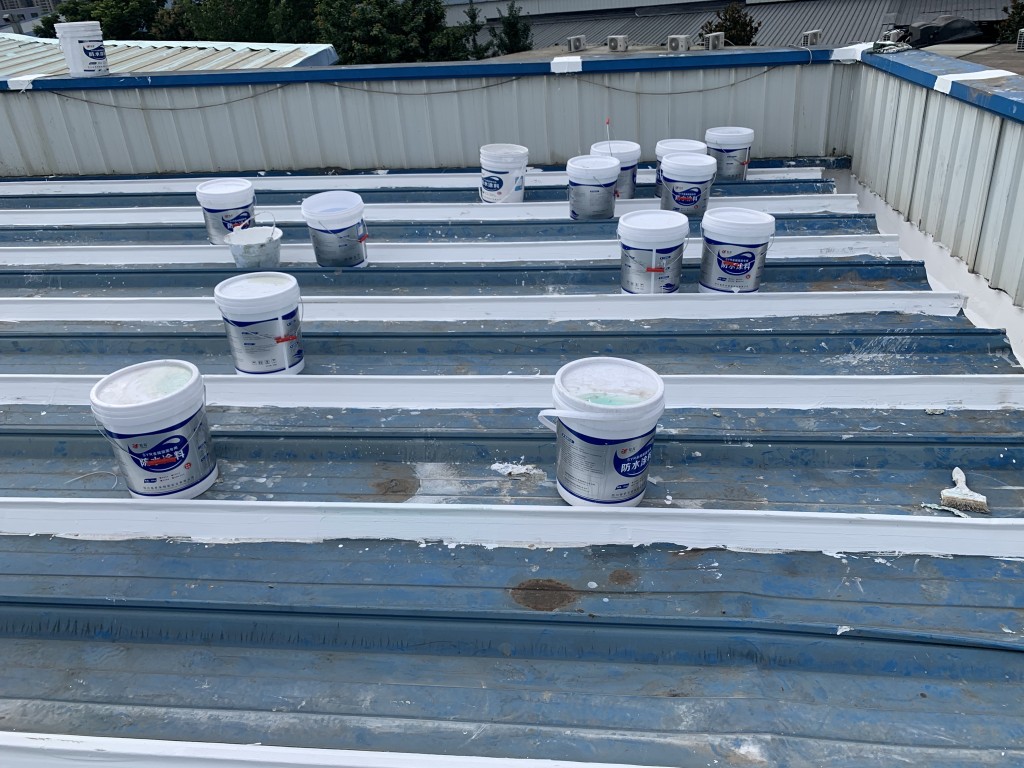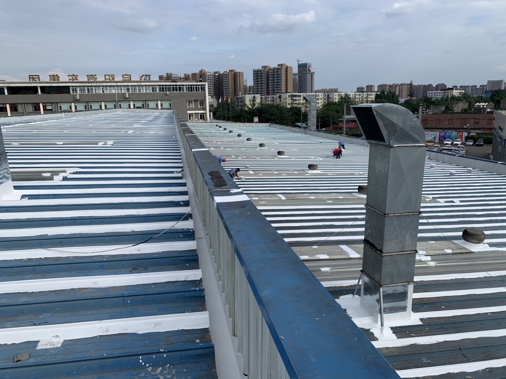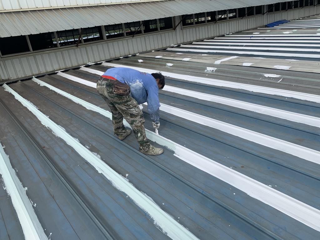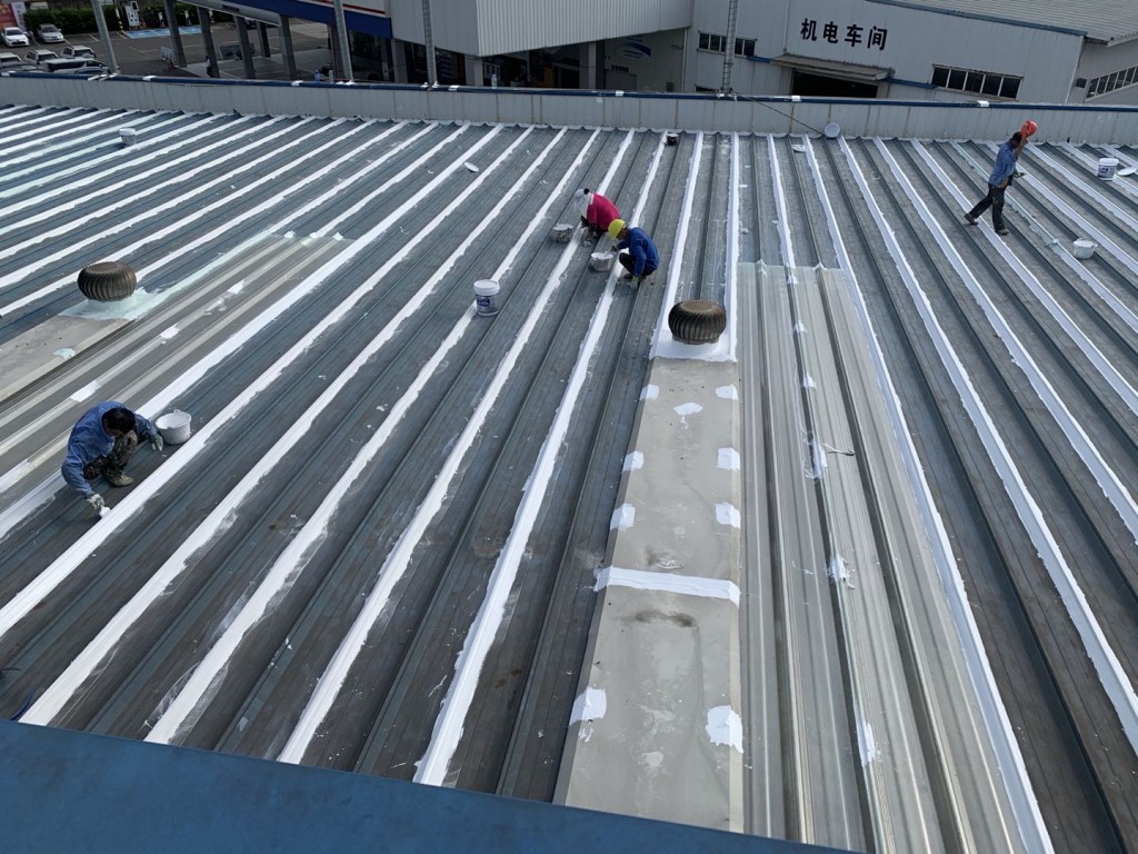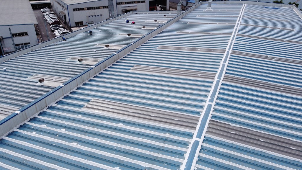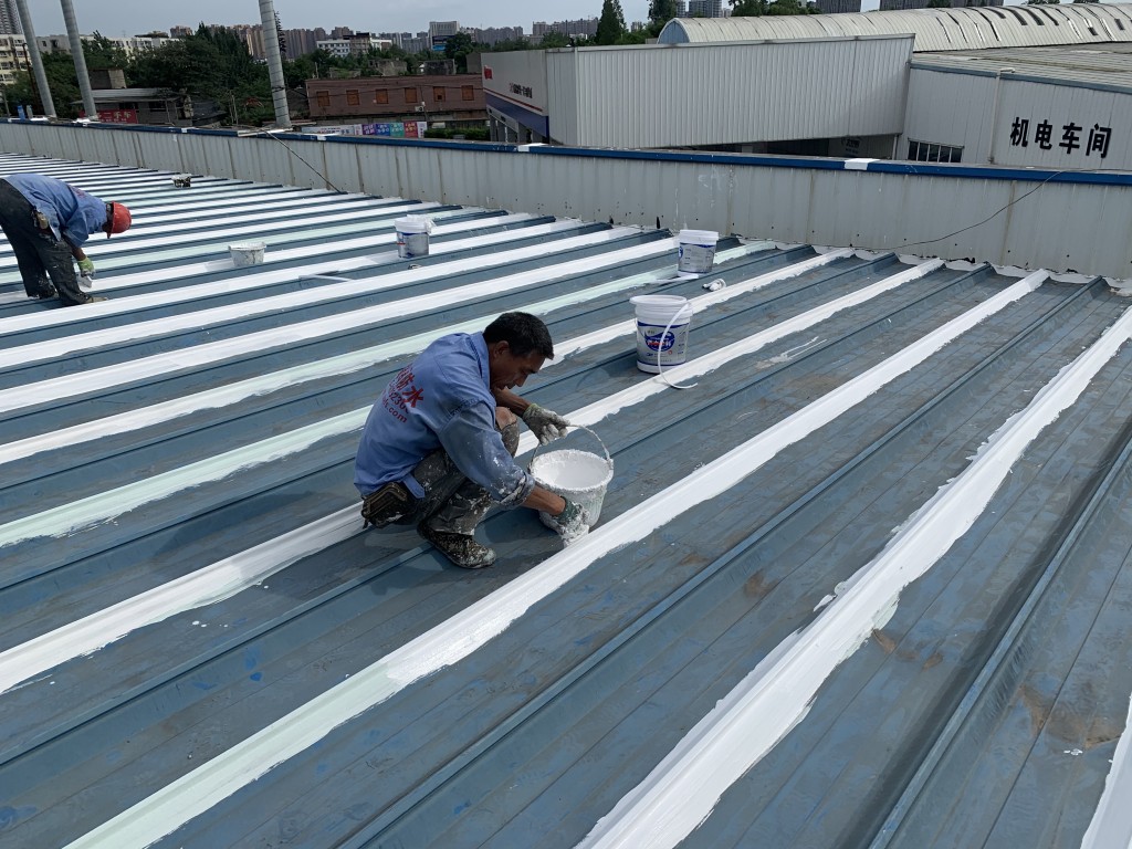 我公司采用的SYR金屬屋面專用防水涂料配合專用縫織聚酯布一布三涂形成的SYR金屬屋面專用防水系統(tǒng)具有防水、防腐、抗紫外線、反射隔熱的效果,特別適合于暴露屋面的使用,耐久性佳。