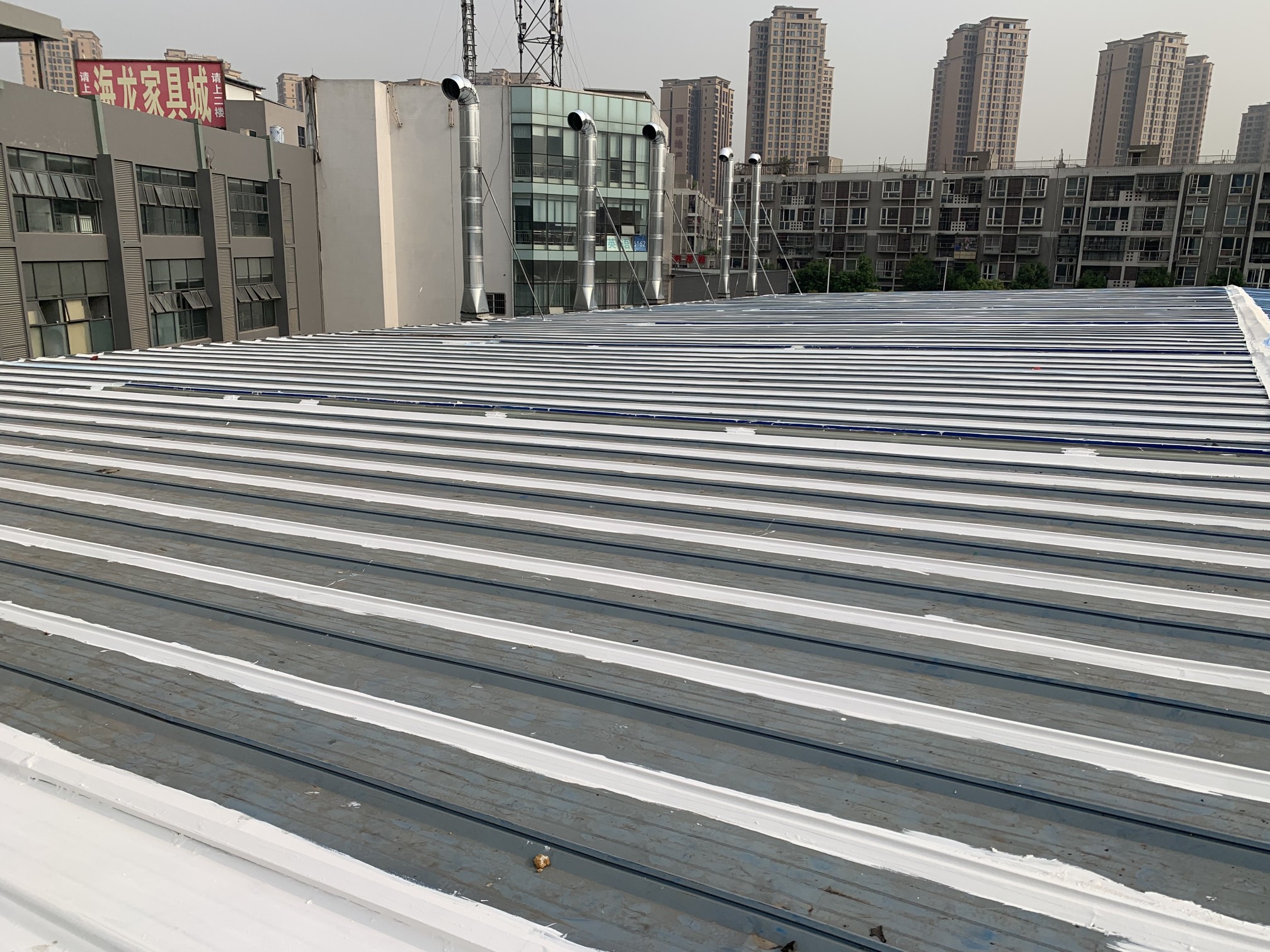 成都市新都區下石橋路啟陽五龍山園區鋼結構彩鋼頂屋面防水補漏由成都蜀禹建筑防水工程有限責任公司施工,采用的蜀禹SYR金屬屋面專用防水涂料配合專用縫織聚酯布進行施工處理的,施工處理后具有防水防腐等多重功能。