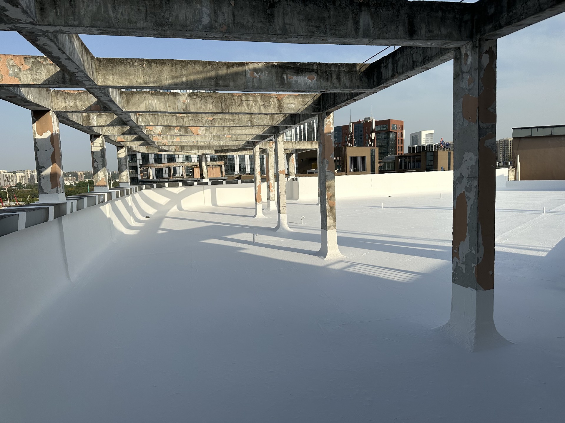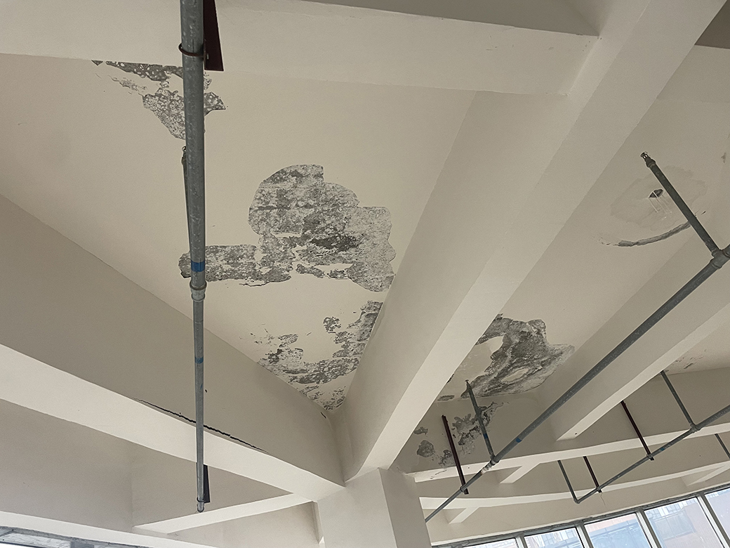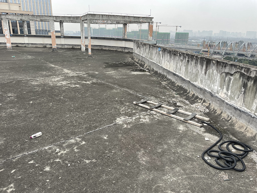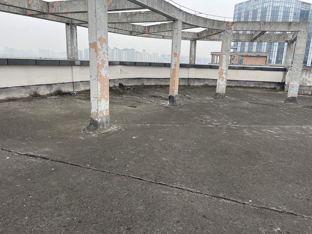 屋頂未施工之前,屋頂表面的保護層已經(jīng)翻砂起殼,個別地方鋼筋都已經(jīng)露出