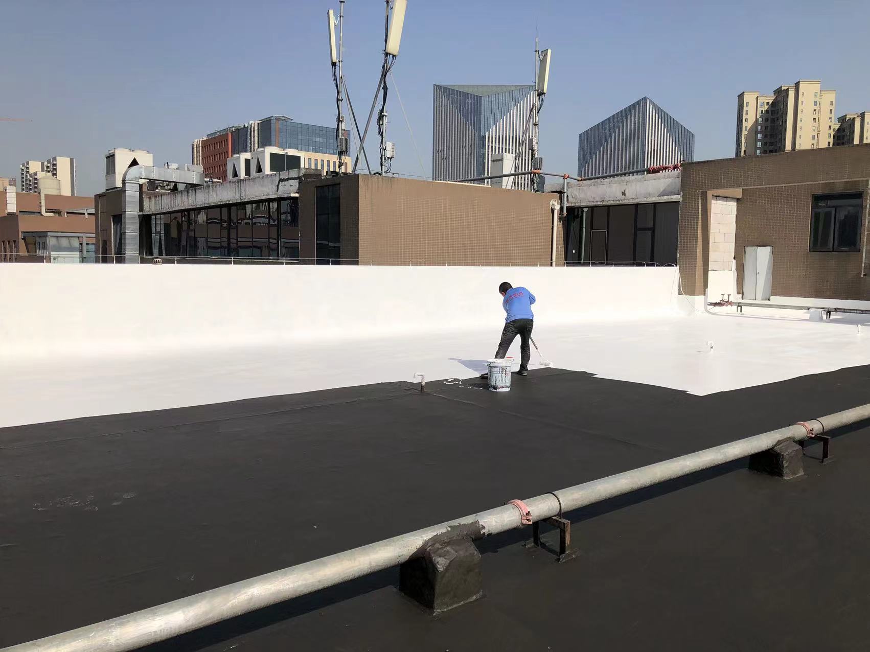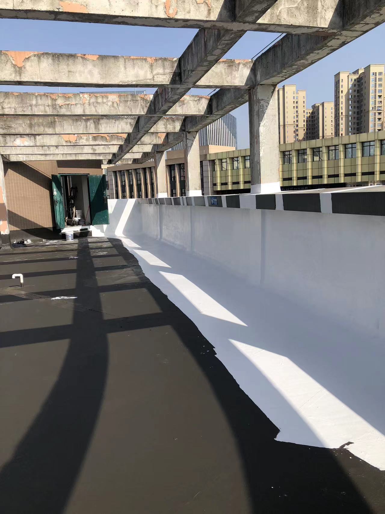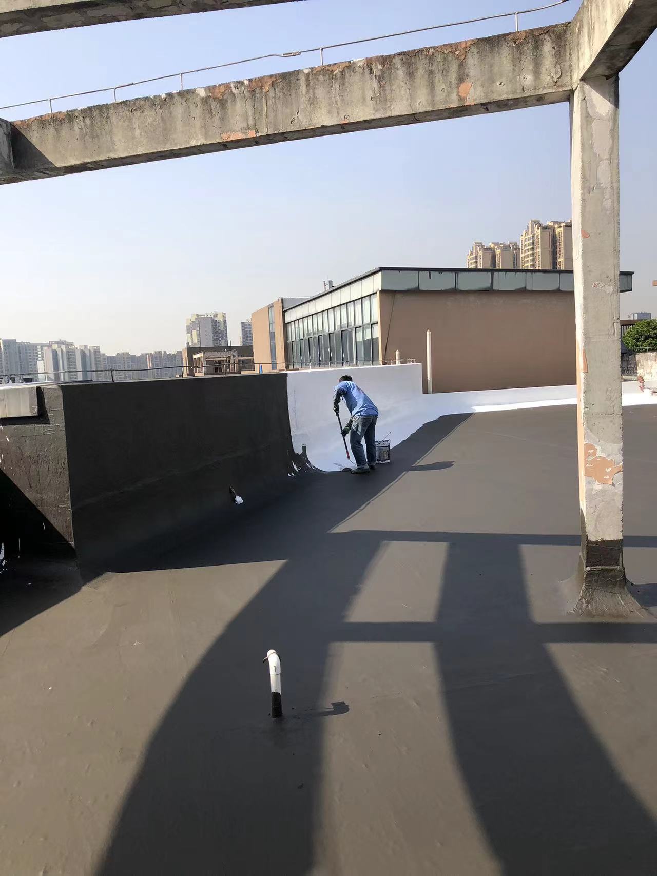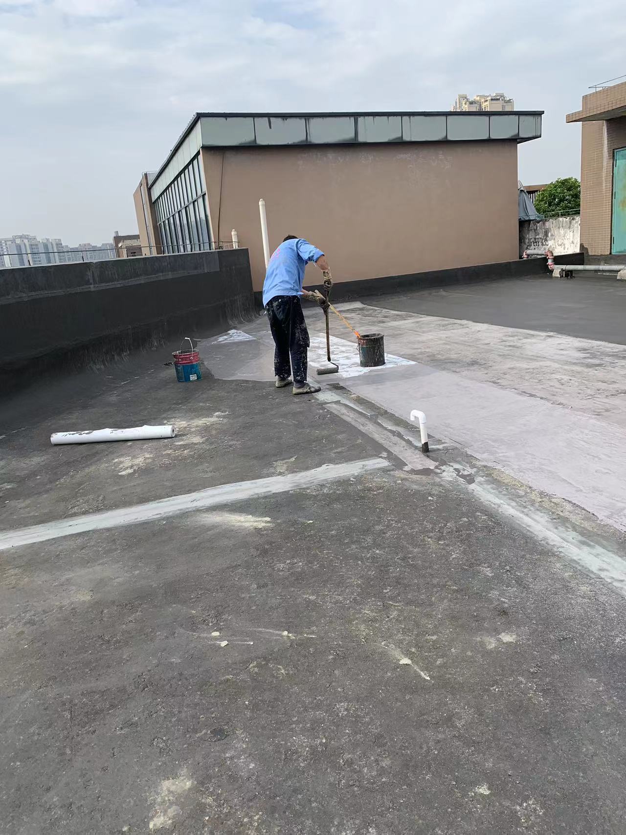 我公司現(xiàn)場施工工藝流程為:先將屋頂基層起殼易脫落的清理掉,破損部位水泥砂漿局部修補,然后基層表面滿涂刷混凝土液體硬化劑進行基層固化處理,這樣處理的好處是,后面做的防水層能夠與基層牢牢的粘結(jié)在一起;待混凝土液體硬化劑固化之后,屋頂?shù)牡孛婕皦γ嫒繚M涂刷蜀禹Ⅰ型聚合物水泥防水涂料然后滿鋪貼專用的縫織聚酯布再涂刷蜀禹Ⅰ型聚合物水泥防水涂料,待干后表面涂刷蜀禹Ⅰ型聚合物水泥防水涂料,等待干后表面再涂刷兩道SYR金屬屋面防水涂料涂層。施工完畢之后,等待施工的防水涂層干透之后,屋頂做閉水試驗一星期后不漏水驗收合格之后交驗。