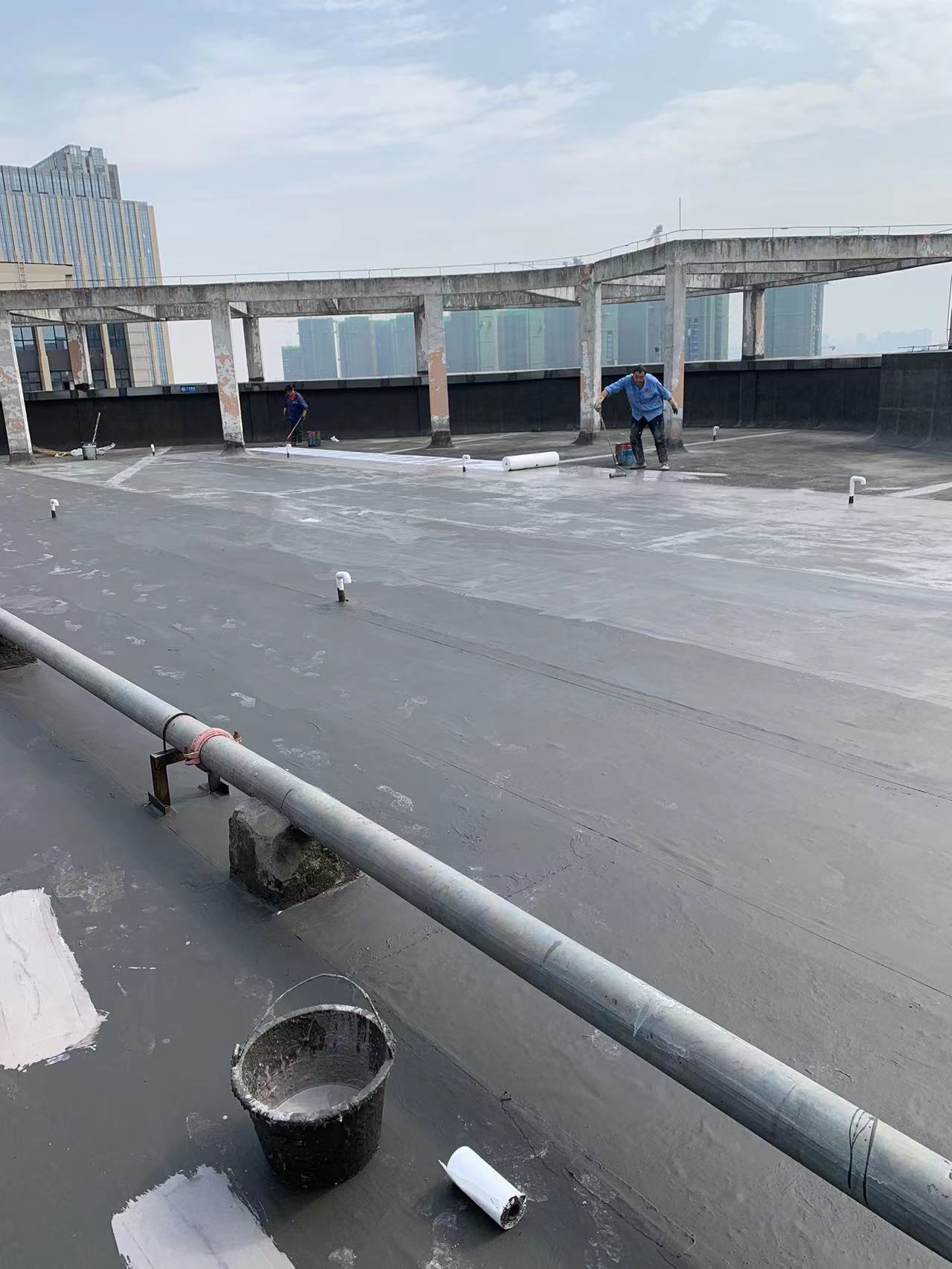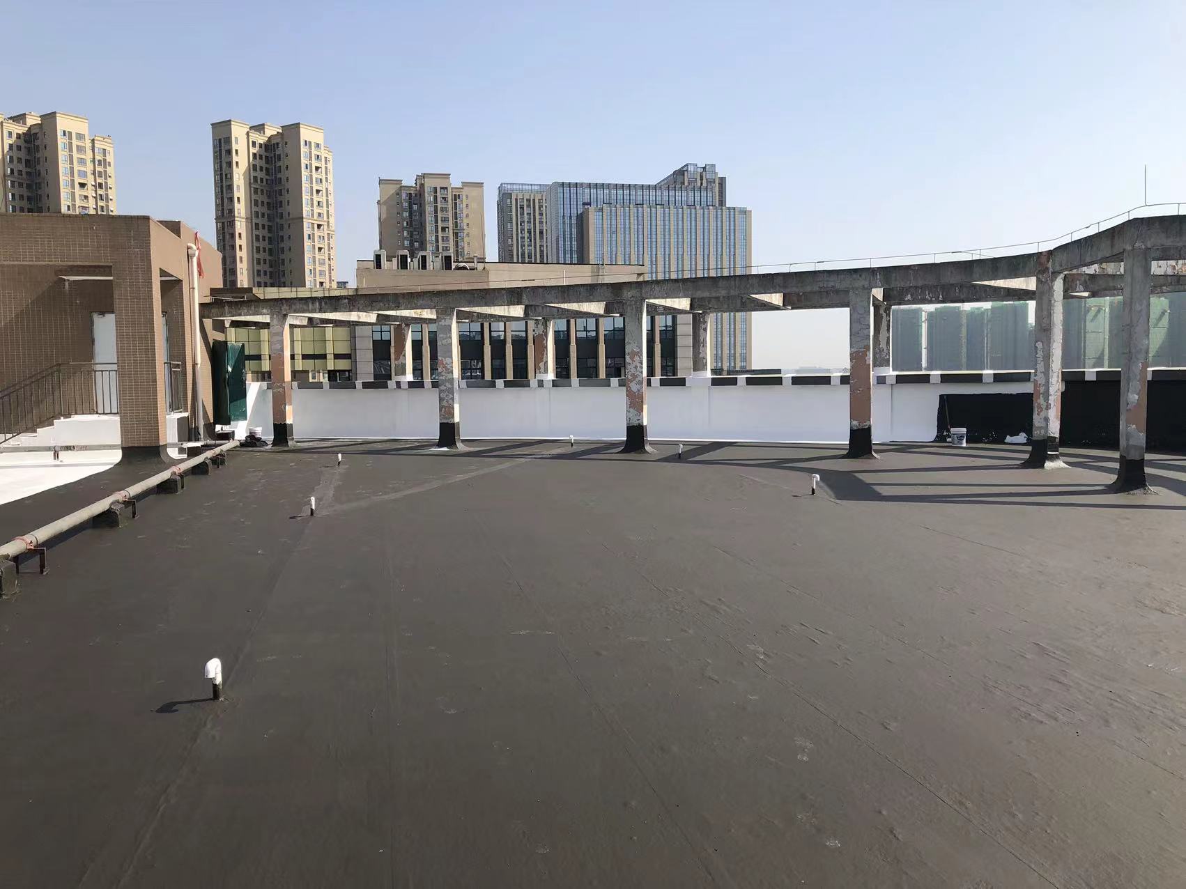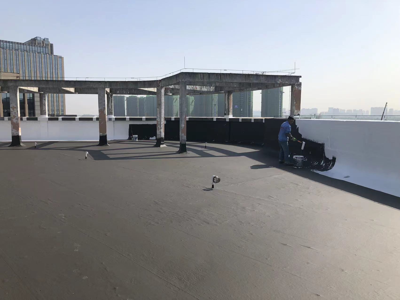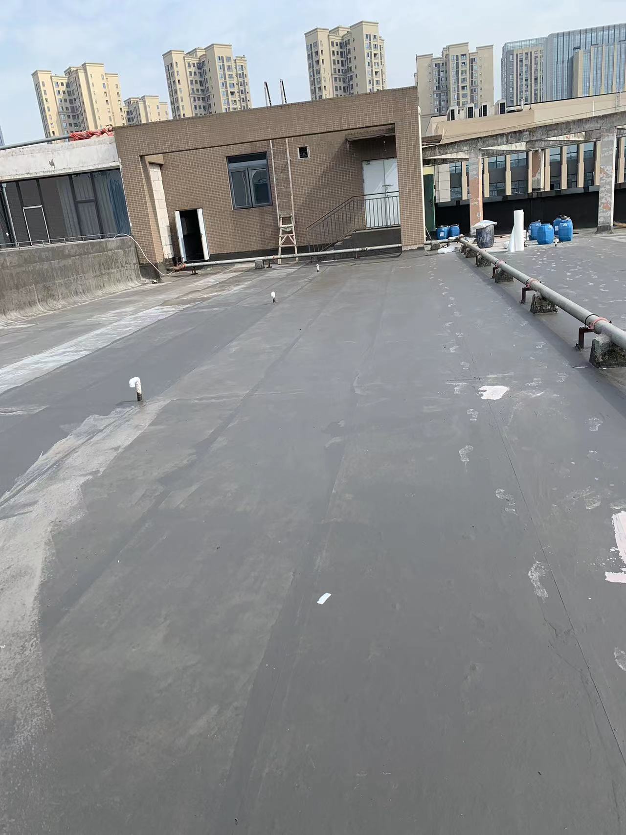 我公司現(xiàn)場施工工藝流程為:先將屋頂基層起殼易脫落的清理掉,破損部位水泥砂漿局部修補,然后基層表面滿涂刷混凝土液體硬化劑進行基層固化處理,這樣處理的好處是,后面做的防水層能夠與基層牢牢的粘結(jié)在一起;待混凝土液體硬化劑固化之后,屋頂?shù)牡孛婕皦γ嫒繚M涂刷蜀禹Ⅰ型聚合物水泥防水涂料然后滿鋪貼專用的縫織聚酯布再涂刷蜀禹Ⅰ型聚合物水泥防水涂料,待干后表面涂刷蜀禹Ⅰ型聚合物水泥防水涂料,等待干后表面再涂刷兩道SYR金屬屋面防水涂料涂層。施工完畢之后,等待施工的防水涂層干透之后,屋頂做閉水試驗一星期后不漏水驗收合格之后交驗。
