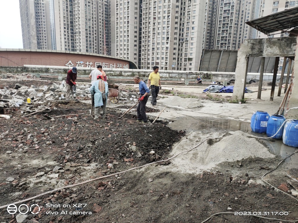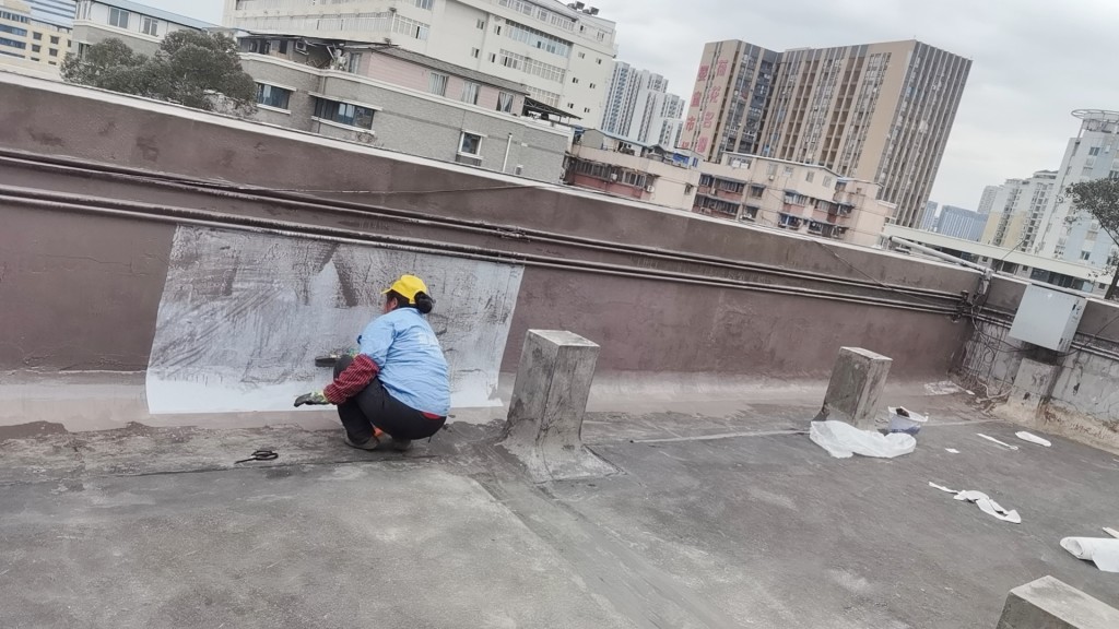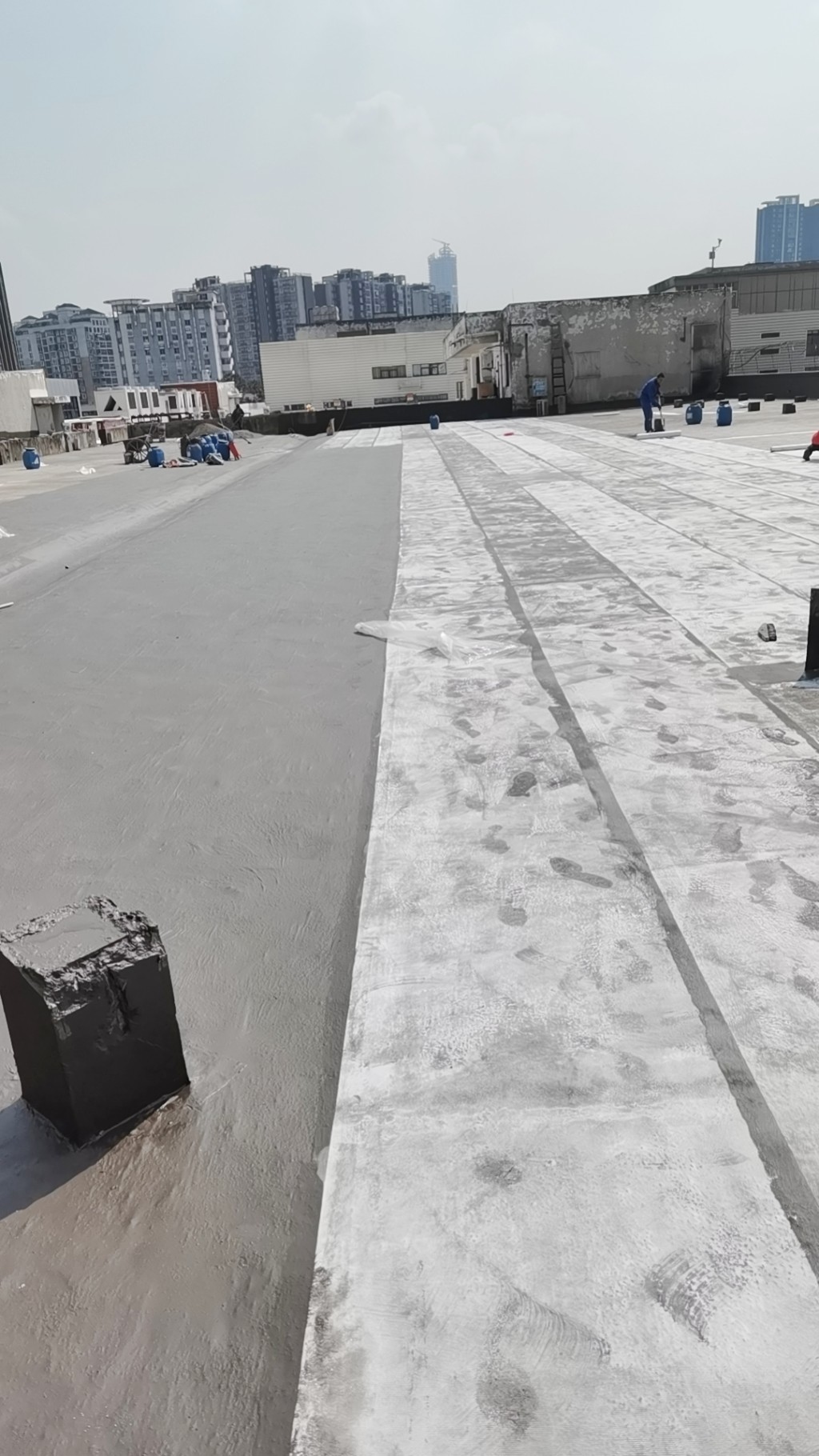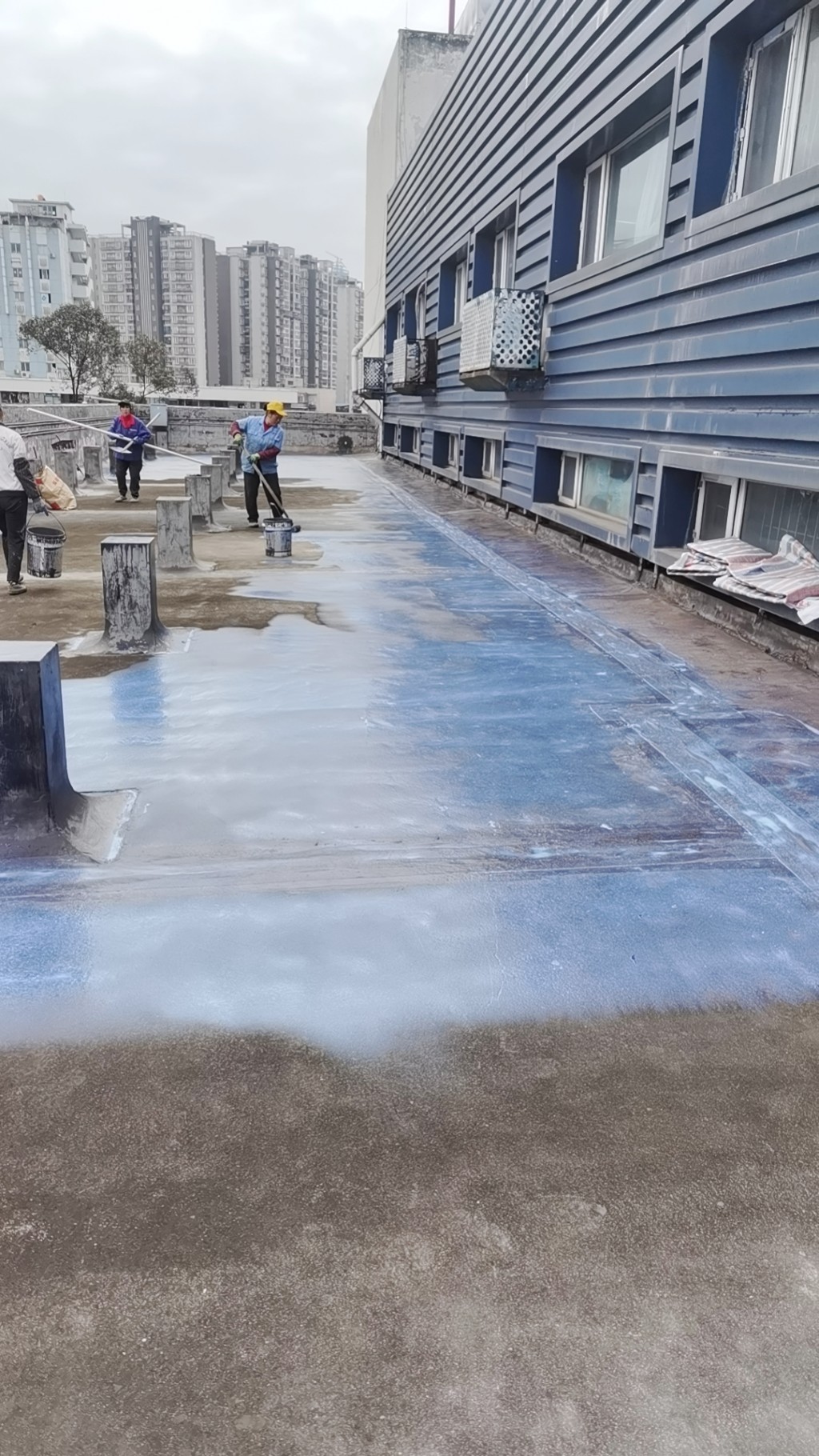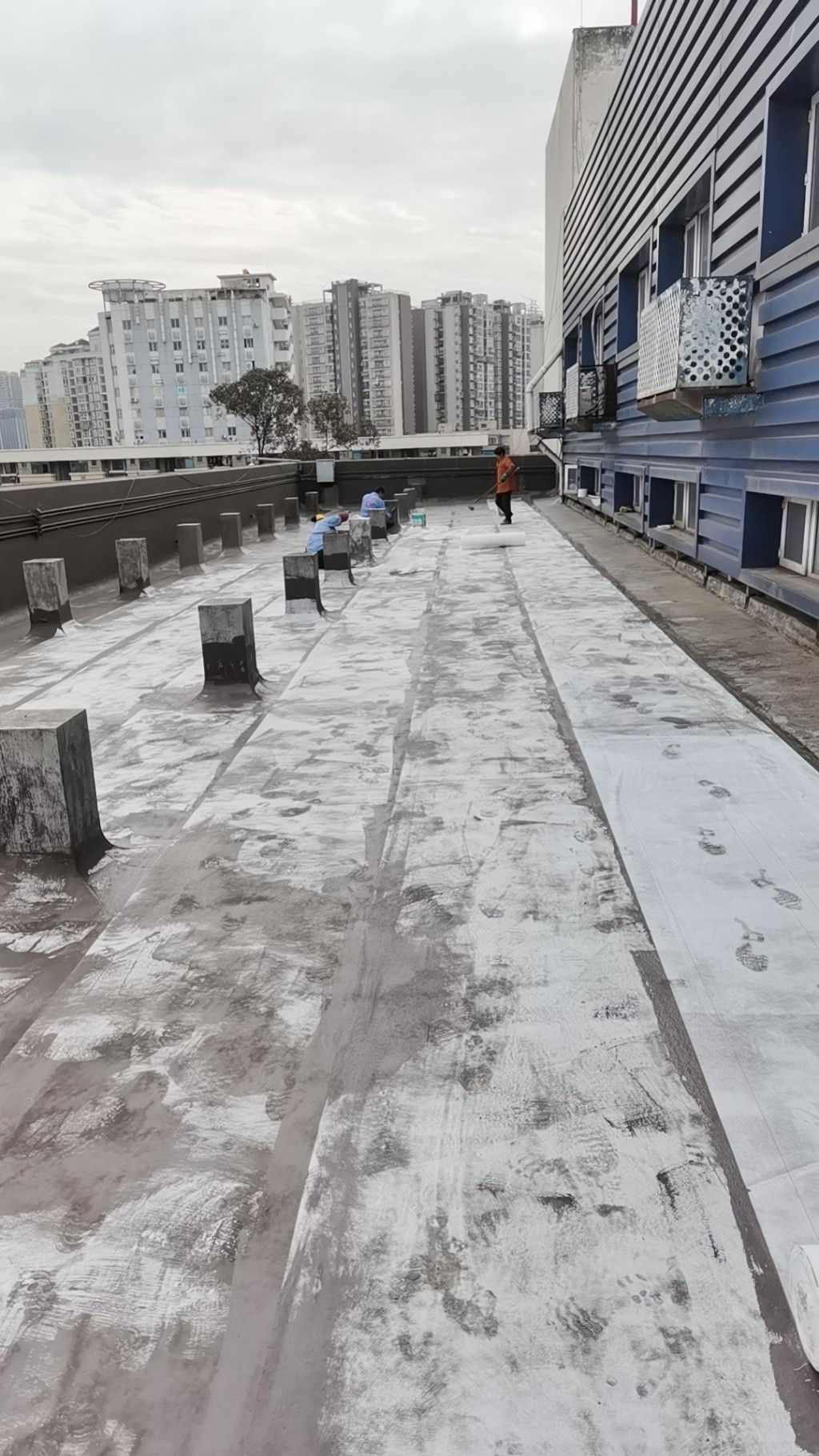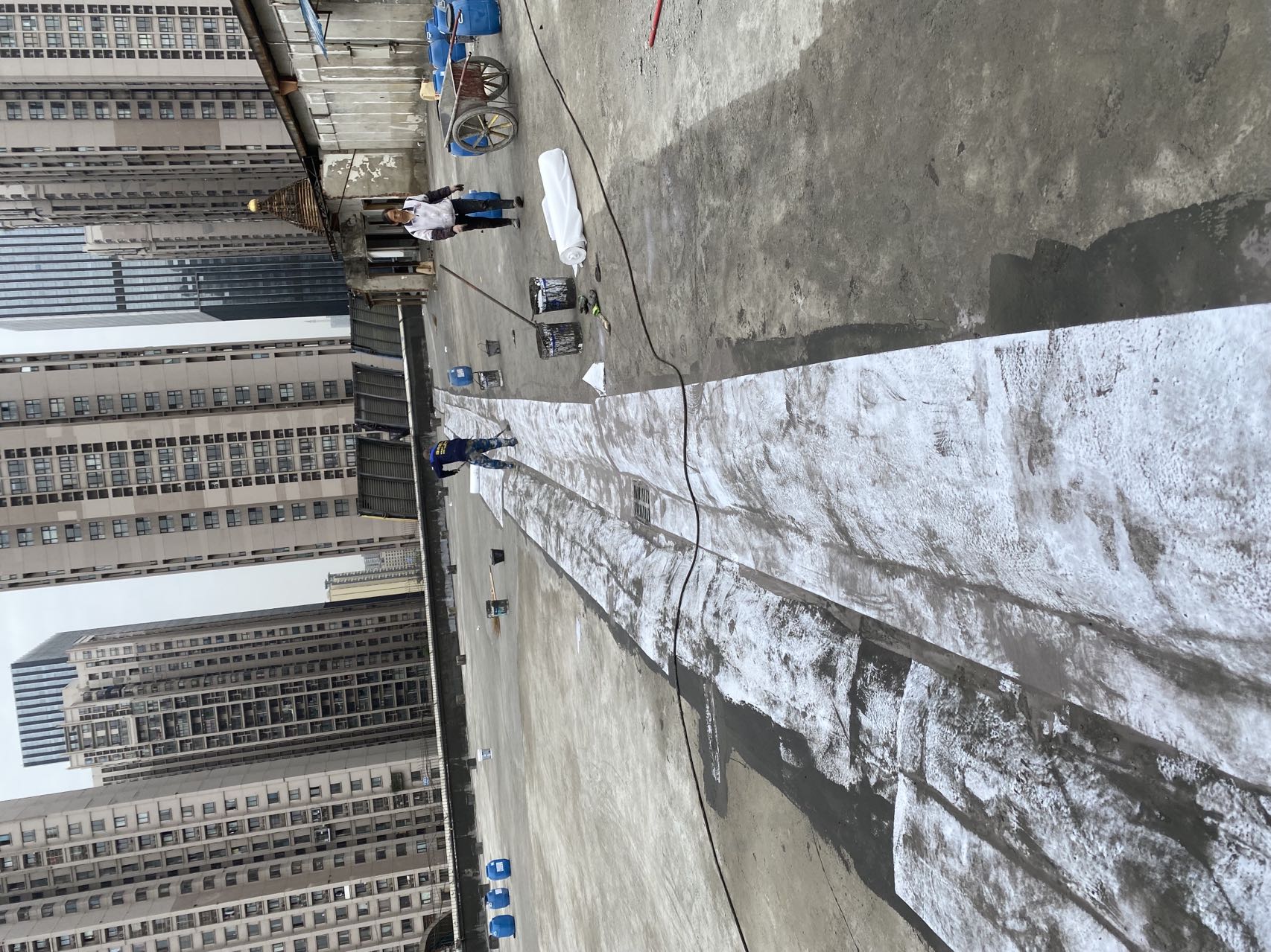 這個工程具有相當大的施工難度,主要是因為屋頂修建了很多花臺,并貼了瓷磚,導致屋頂非常雜亂。為了確保工程的順利進行,在施工前,我們首先將屋頂?shù)幕ㄅ_拆除,地面的瓷磚以及剛性保護層拆除,并將建渣搬運下樓清運出場。待地面平整好后,我們在基層表面滾涂混凝土液體硬化劑,對基面進行固化處理。