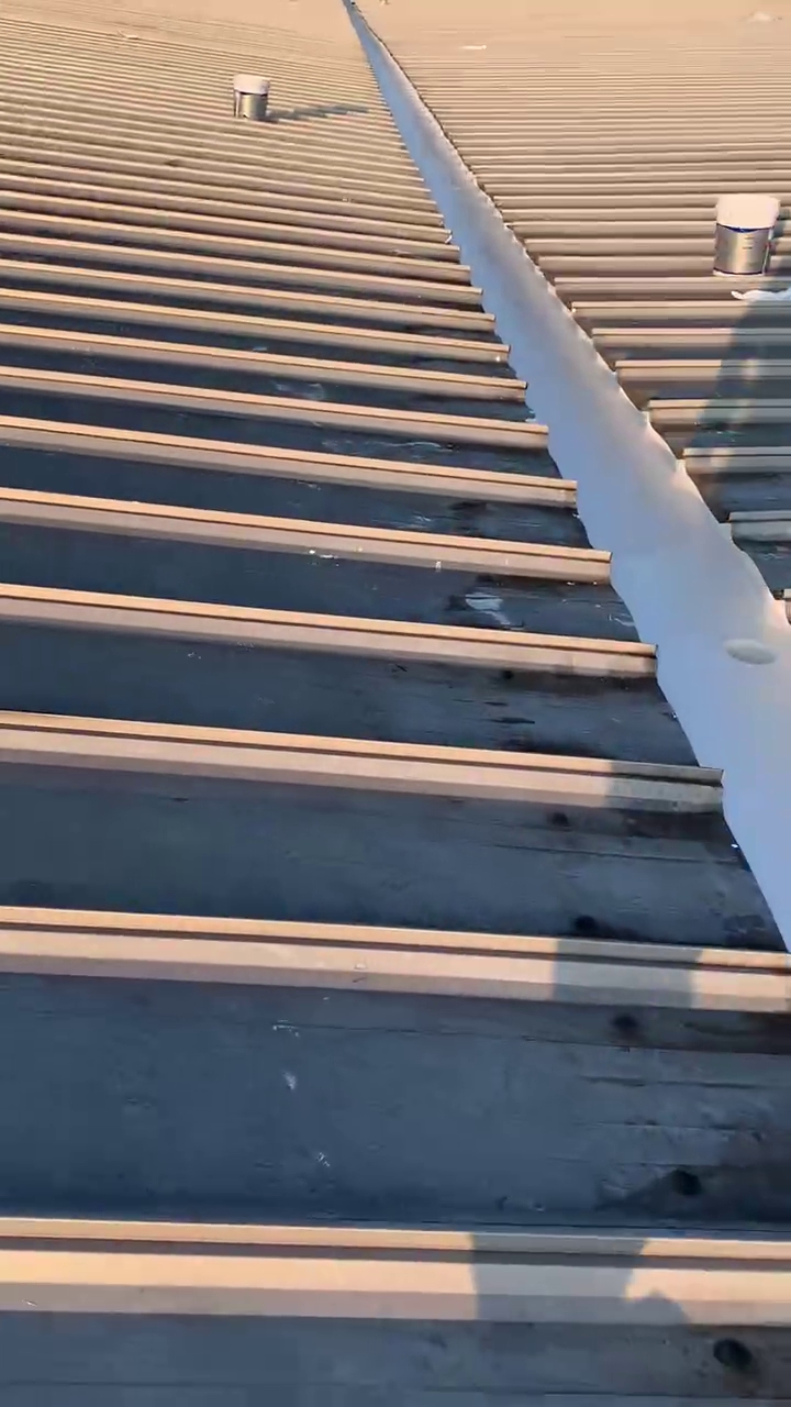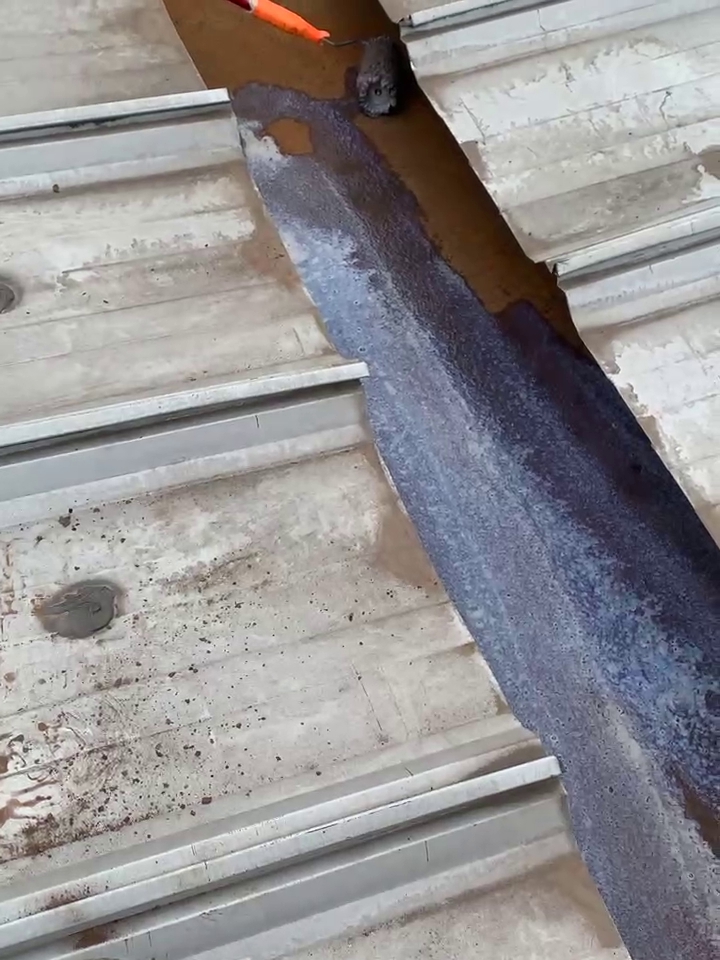 該廠房的彩鋼頂天溝在長期受到酸雨侵蝕下,天溝內個別下水管口銹蝕爛掉,導致雨水在降雨時從漏斗旁滴落,造成下水管周邊漏雨。同時,天溝內部的鐵板也出現了嚴重的銹蝕現象,已經出現起殼脫層,如果不及時處理,天溝可能會銹蝕穿孔,導致漏水,對廠房的生產設備及安全生產構成威脅。