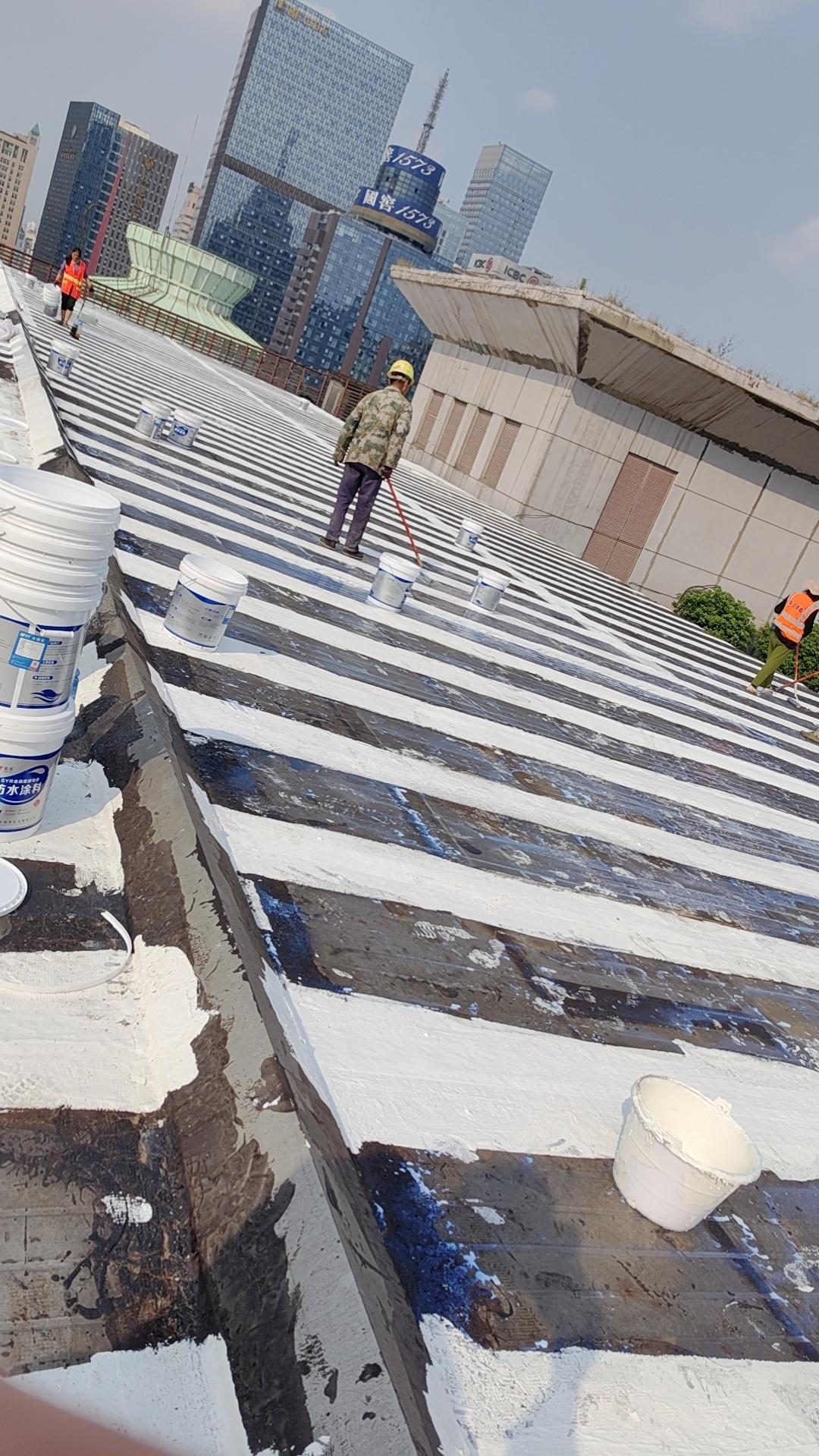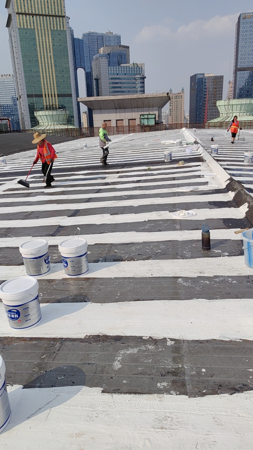 在完成關鍵部位的防水處理后,公司對整個彩鋼頂面進行了滿滾涂兩遍SYR金屬屋面專用防水涂料的操作。這一步驟不僅進一步加強了彩鋼頂的防水性能,還提升了其防腐能力,有效延長了彩鋼頂的使用壽命。