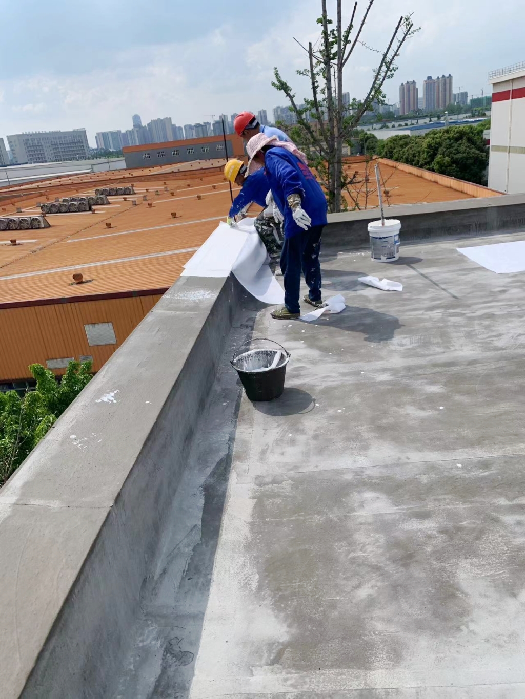 待第道一布兩涂防水涂料干燥后,我們涂刷SYR金屬屋面防水涂料,并再次鋪貼專用縫織聚酯布,表面再涂刷SYR金屬屋面防水涂料。這一材料的選用,不僅進一步提升了防水性能,同時也賦予了屋頂表面優異的反射隔熱效果。在涂刷完第二層SYR金屬屋面防水涂料后,我們靜待其干燥,隨后又涂刷了一層,確保防水系統達到更佳效果。