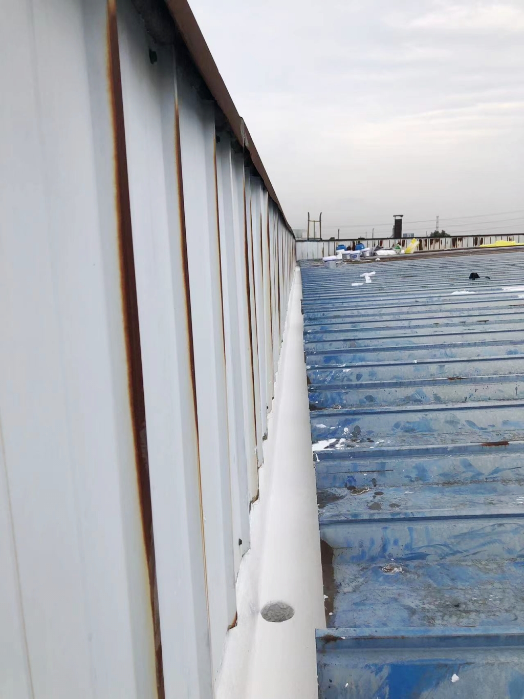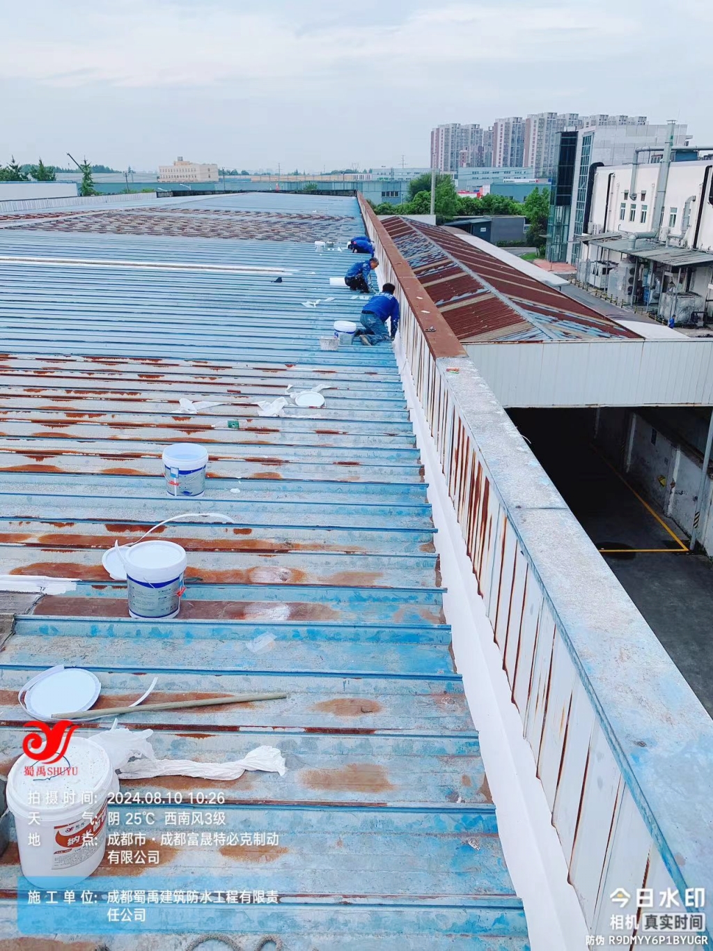 面對這一挑戰(zhàn),成都蜀禹建筑防水工程有限責(zé)任公司迅速響應(yīng),組織專業(yè)團(tuán)隊(duì)對現(xiàn)場進(jìn)行了全面勘查,并制定了針對性的修復(fù)方案。方案的核心在于采用SYR金屬屋面專用防水涂料配合專用縫織聚酯布進(jìn)行一布三涂的防水處理。這種處理方式不僅能夠有效解決現(xiàn)有滲漏問題,還能增強(qiáng)屋面的整體防水性能和耐久性,為廠房提供長期保護(hù)。