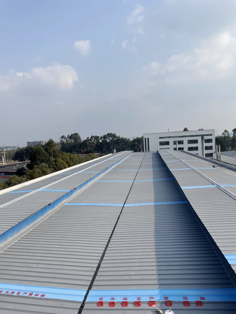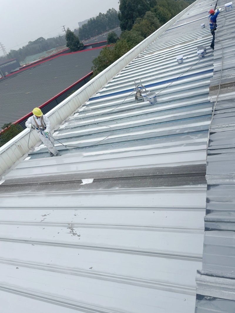 3. 整體防腐翻新:為了全面提升屋面的防腐性能,對整個廠房彩鋼頂屋面滿涂一遍 SYR 金屬屋面專用防水涂料進行防腐翻新。待干燥后,再涂第二遍該防水涂料,形成更厚、更堅韌的防腐防水層。值得注意的是,采光瓦表面噴涂的涂料調色與彩鋼瓦表面顏色不同,這樣便于施工后分辨屋頂采光瓦的位置,避免后續維護中出現誤操作。