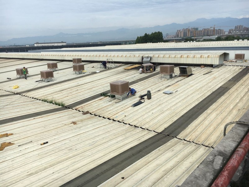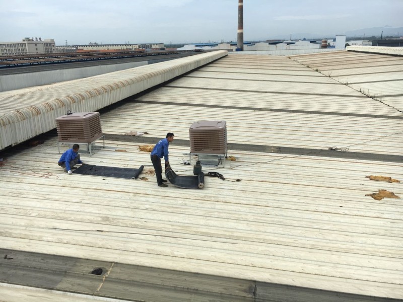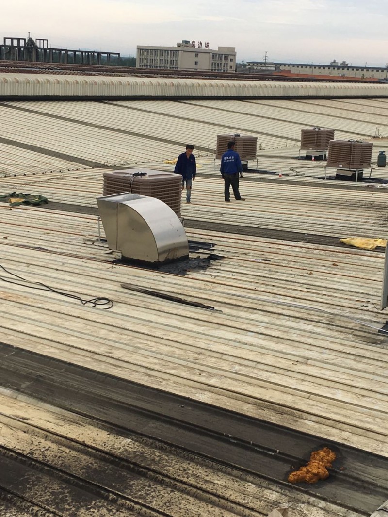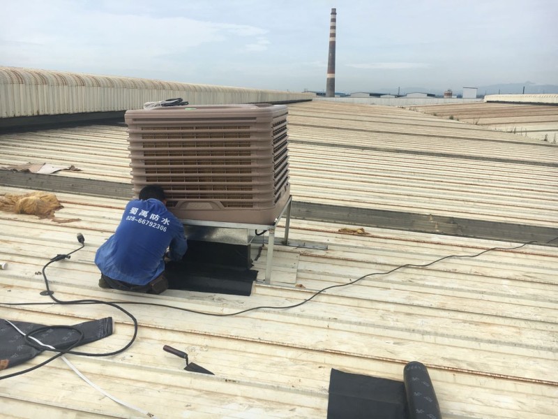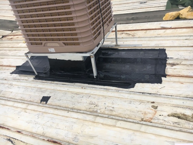 成都市大邑縣工業區龍廚食品廠房內由于夏季溫度太高,廠房內安裝冷風機,但是由于是在以前已經修建好的彩鋼頂上開孔安裝冷風機,冷風機安裝好之后,冷風機排風管穿過彩鋼頂的地方開的孔周邊漏水,我公司采用瀝青防水卷材施工,對排風孔周邊進行了防水補漏處理。